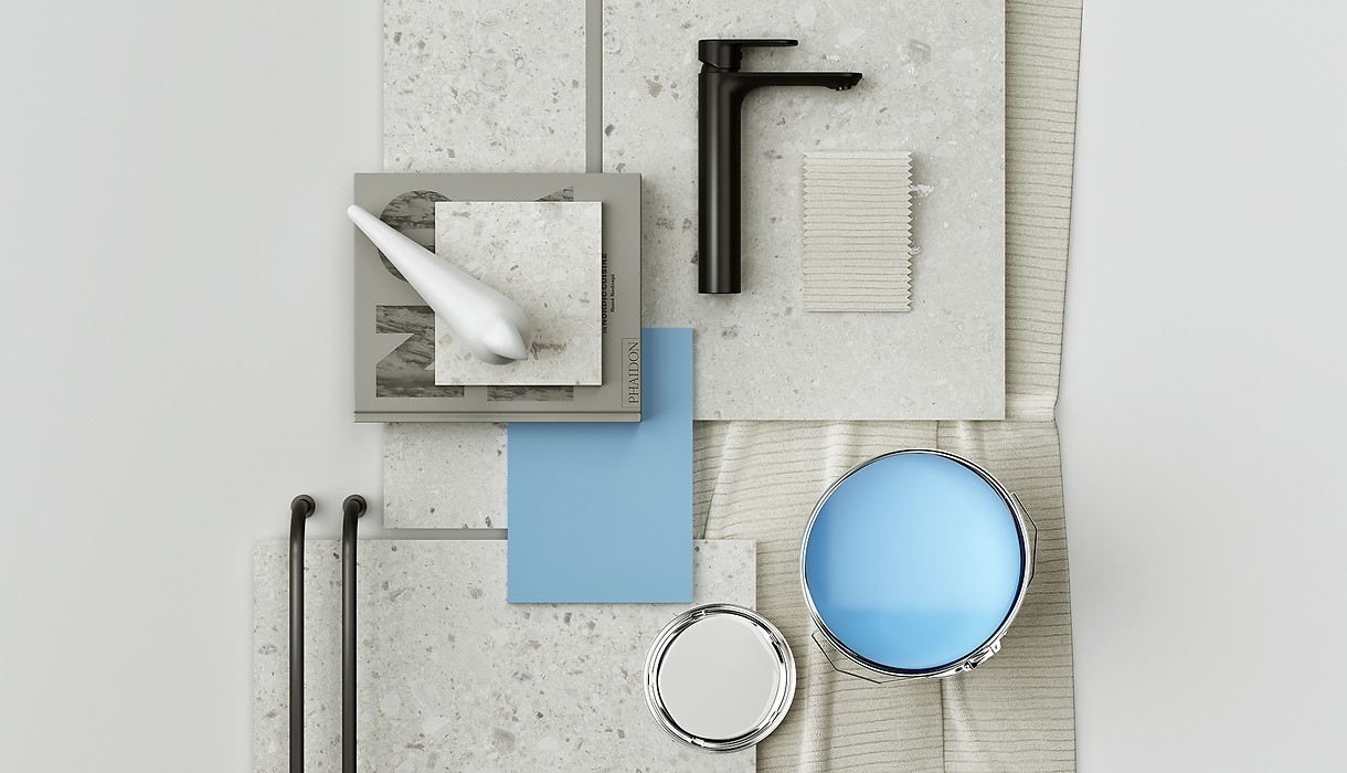In the base design of the MEET ME collection, referring to the impressive terrazzo, small stones of different sizes mix together in subdued colours with an unusual colour palette – from white and grey to single accents of blue and beige. The pattern fills the entire surface of the tiles creating a multi-dimensional and deep effect. The base terrazzo tile with a satin finish (29.8 × 59.8 cm) and the porcelain stoneware tile (59.8 × 59.8 cm) with the same pattern creates a modern, sensual interior effect. This can be balanced by the white satin-smooth tile (29.8 × 59.8 cm) and the silver matt border (2 × 59.8 cm), which, when positioned vertically, completes the décor. The rich pattern and colour accents of beige and blue on the wall and floor tiles create the perfect base for a variety of arrangements. The colours are subdued, so it is the accessories that determine the tone of the interior. Thanks to the range of colours, a bathroom with the MEET ME collection can change depending on the completing elements. Powder pink warms up the interior, blues and greys give it a maritime or New York flair, and sandy elements create a natural effect.